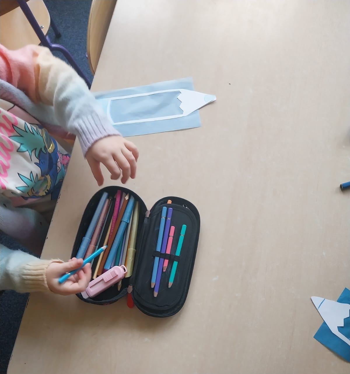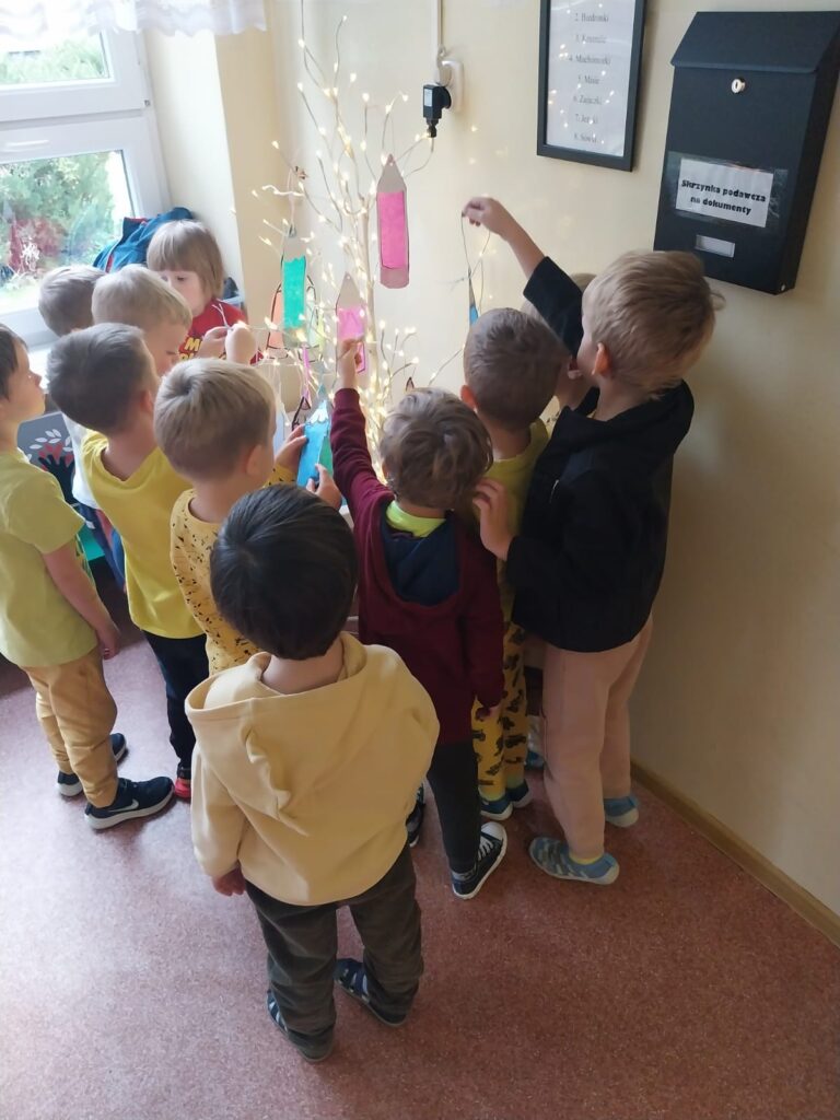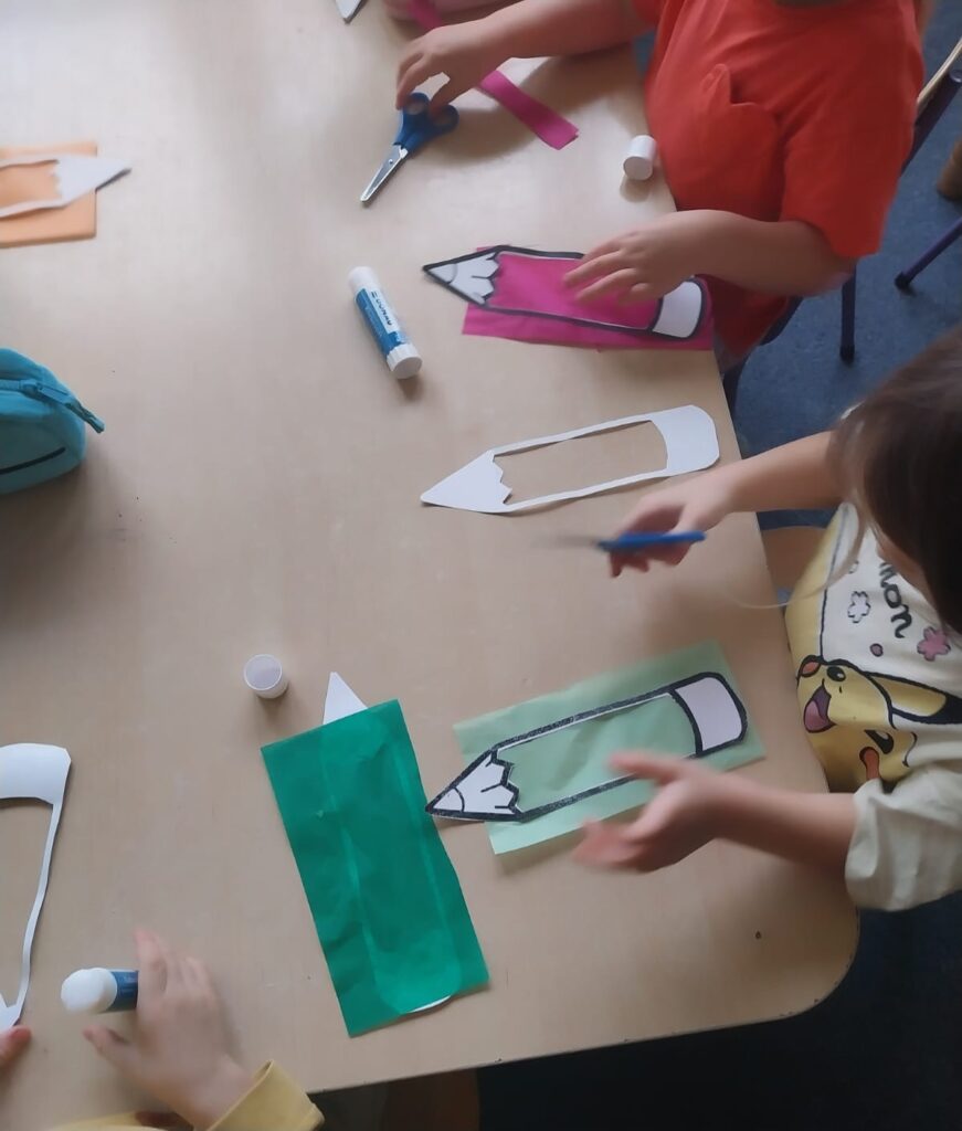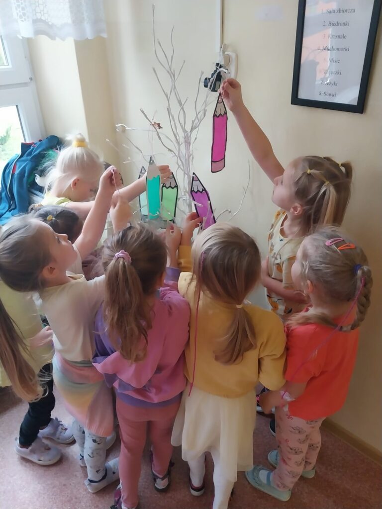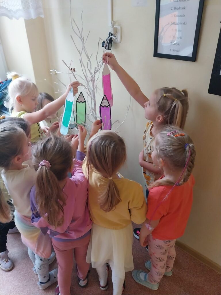 Dziś grupa Zajączków świętowała Dzień Kredki. 🐰🖍️ Dzieci rozmawiały o tym wyjątkowym święcie i dowiedziały się, skąd się wzięło oraz dlaczego kredki są takie ważne w ich codziennej pracy. Z tej okazji wykonały kolorowe prace plastyczne – witrażyki w kształcie kredek, które zawiesiliśmy na naszym drzewie zajączkowym w holu. Był to dzień pełen barw, kreatywności i radości. 🎨🐇