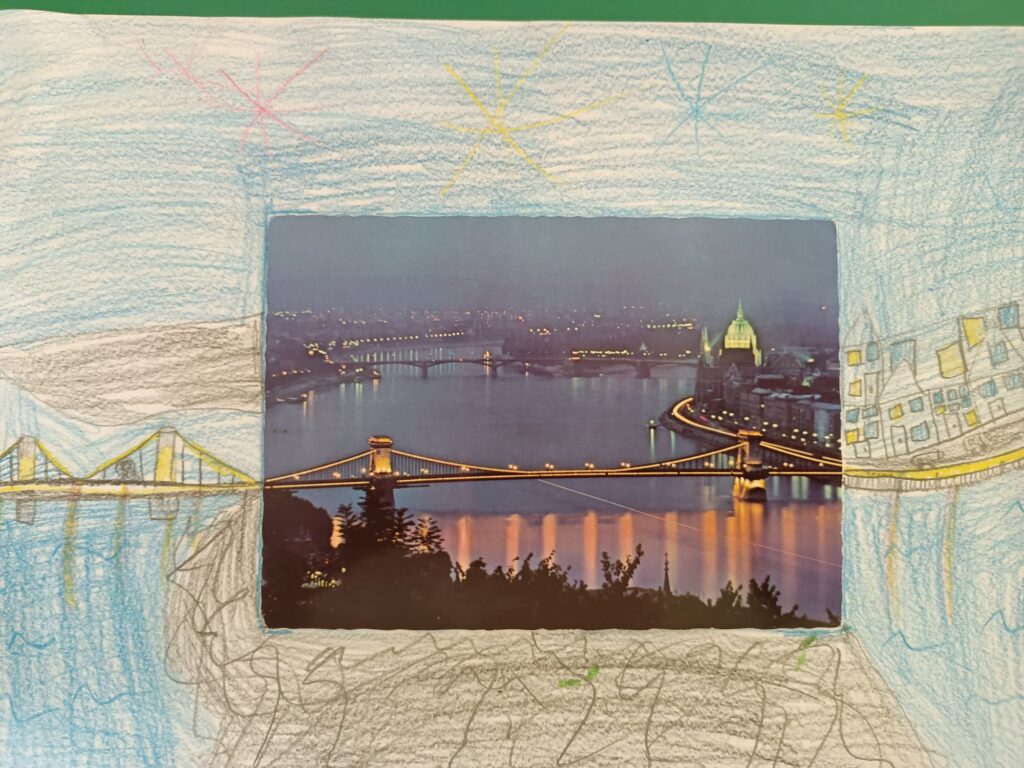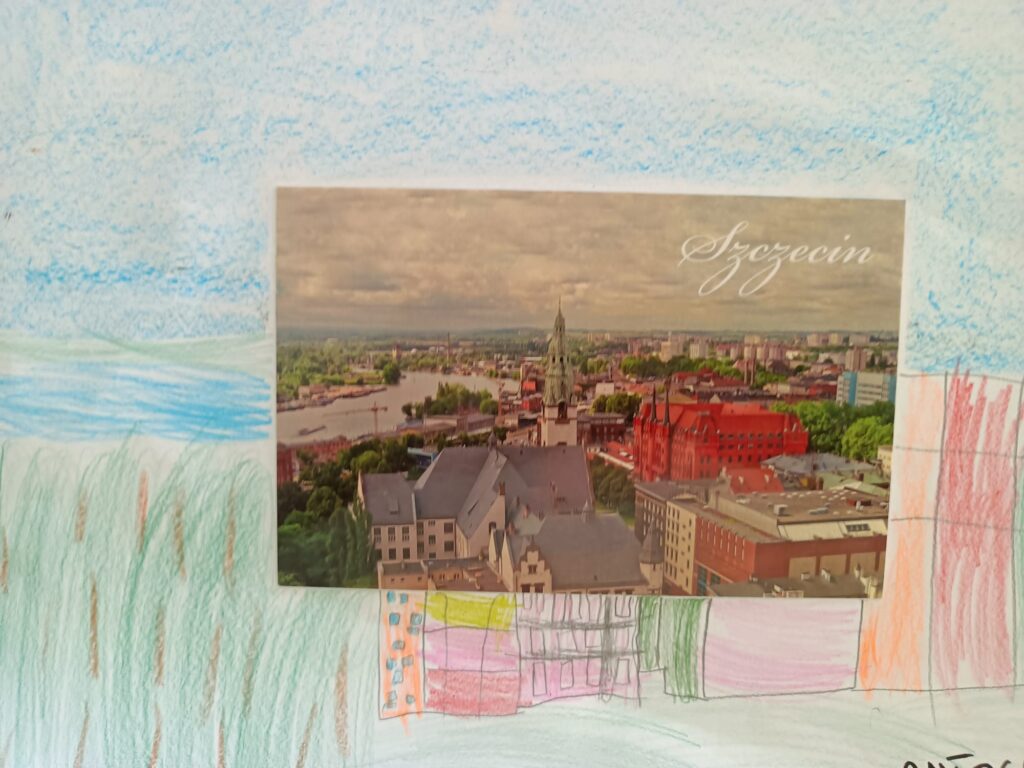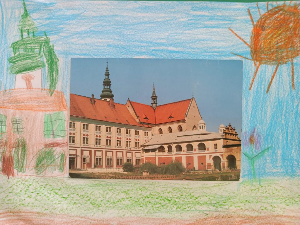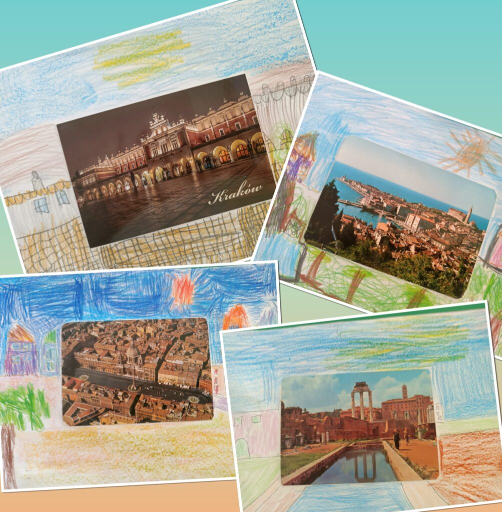 W grupach Krasnale i Biedronki dzieci wzięły udział w niezwykłym zadaniu plastycznym. Punktem wyjścia stały się pocztówki z różnorodnymi ilustracjami, które mali artyści mieli za zadanie „ożywić” i twórczo rozbudować – dorysowując dalszą część obrazu oraz dopowiadając własną historię.