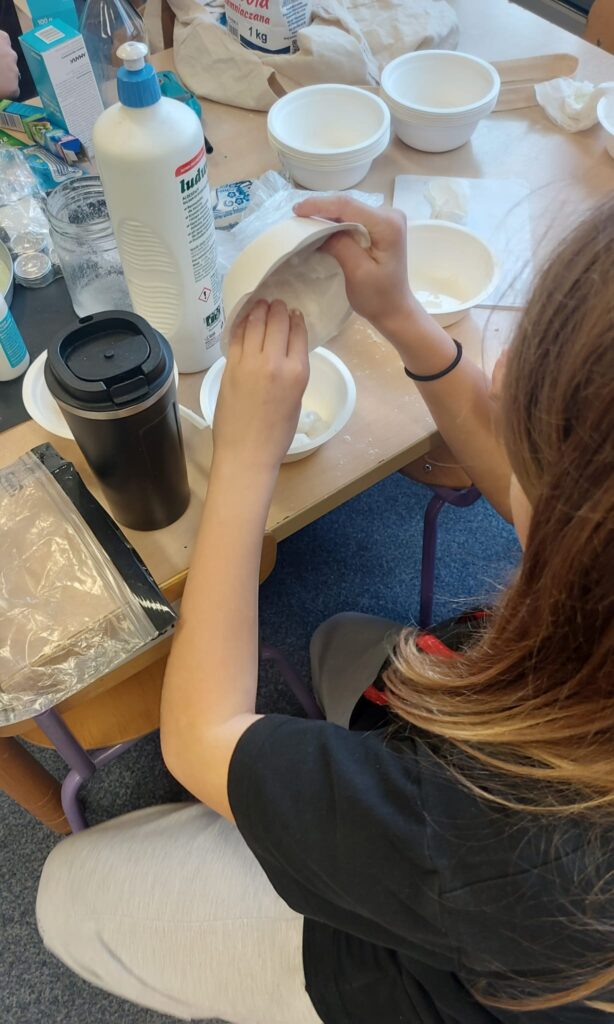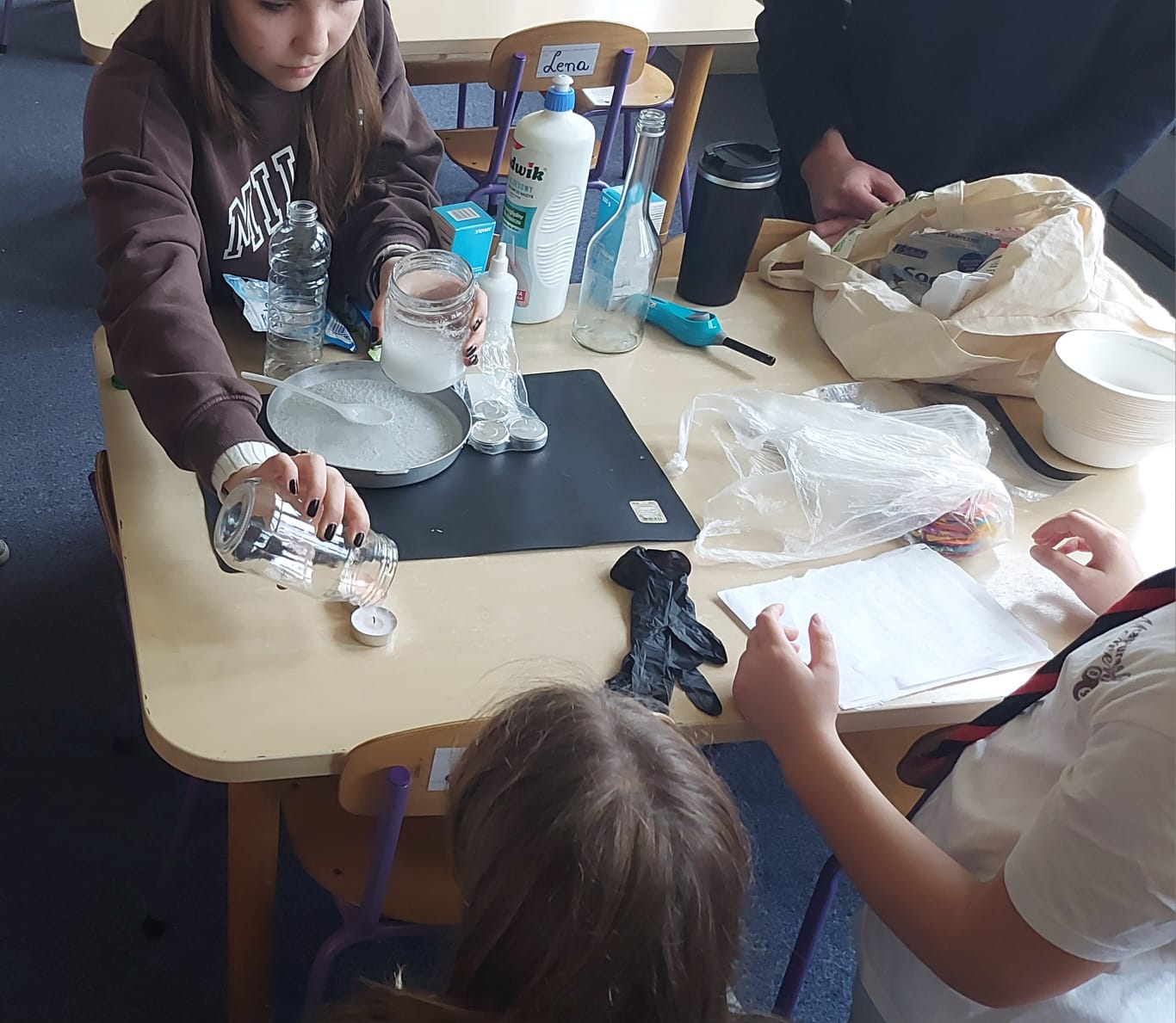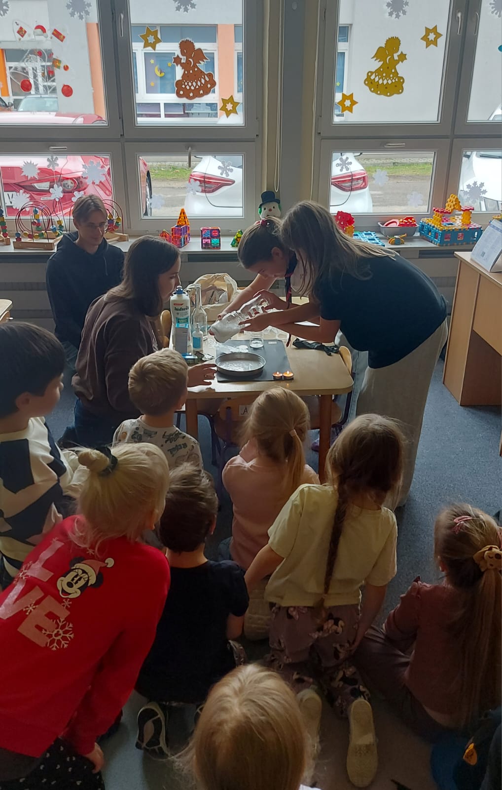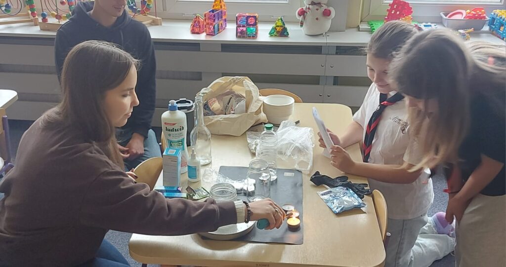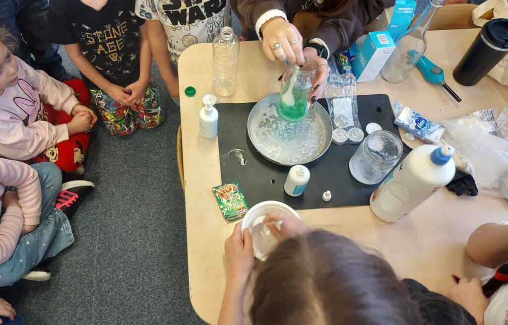 Dzisiejszego dnia w grupie Zajączków 🐰 gościliśmy harcerzy ⛺, którzy przygotowali dla dzieci fascynujące eksperymenty 🧪. Przy użyciu prostych materiałów – sody, słoików, świeczek i mąki ziemniaczanej – przedszkolaki obserwowały interesujące reakcje i zachowanie gazów. Zajączki z ogromnym zaangażowaniem badały, dotykały i odkrywały 🔍✨ świat nauki w praktyce!