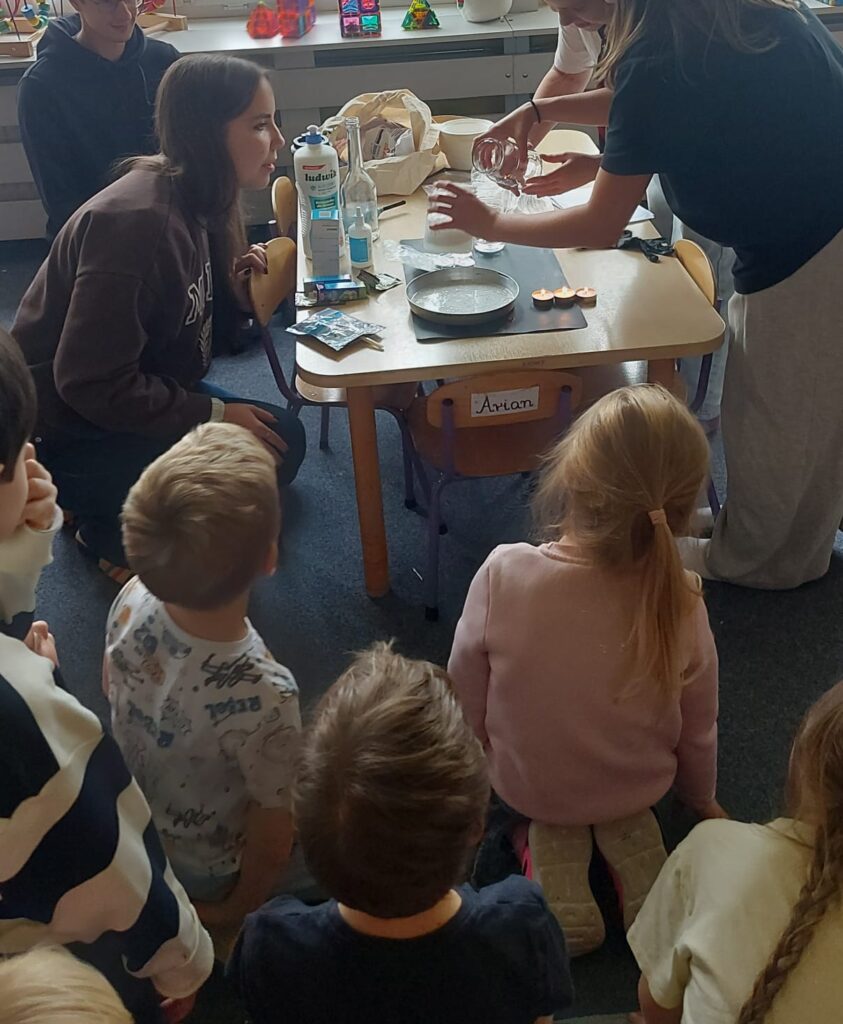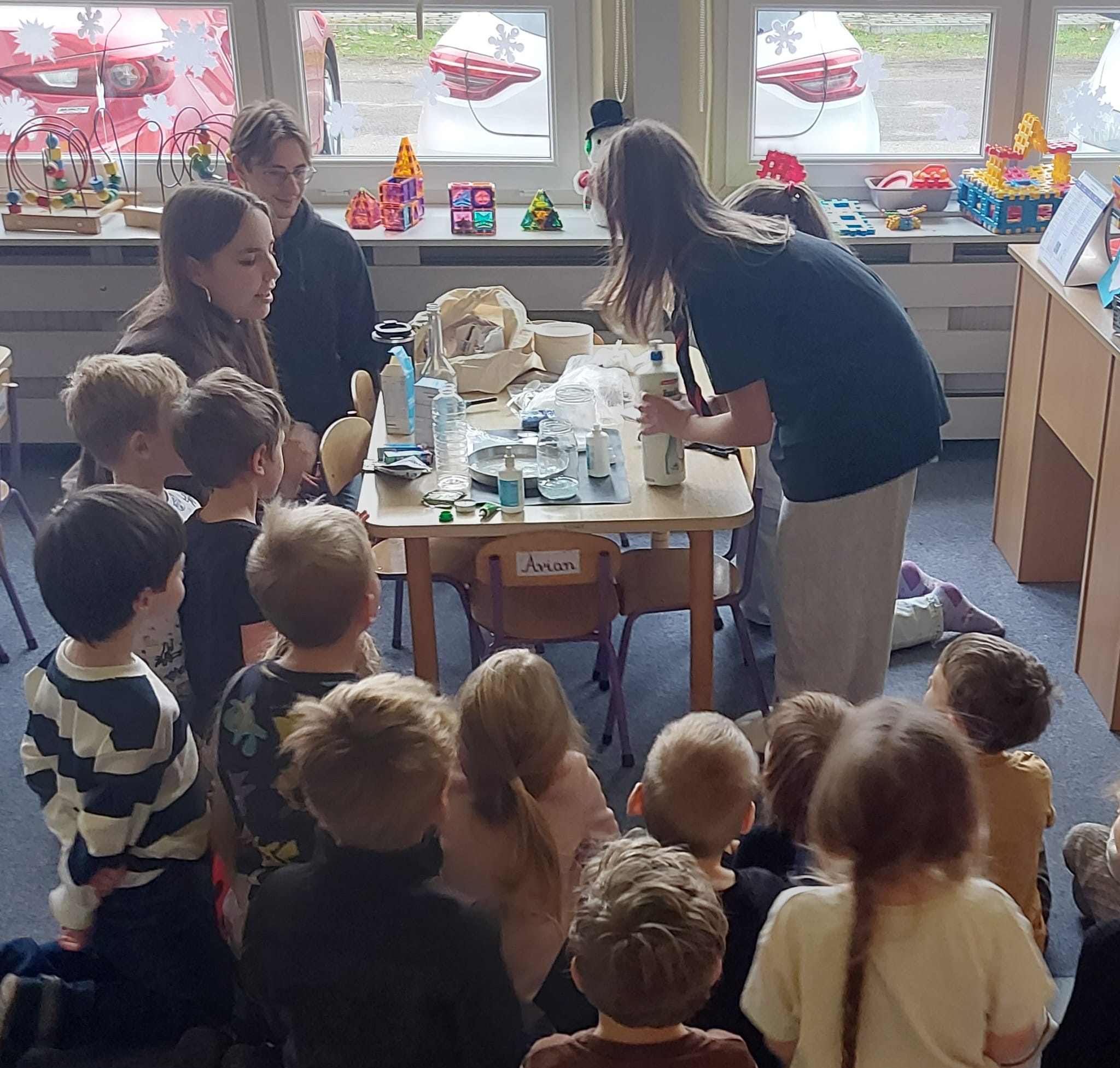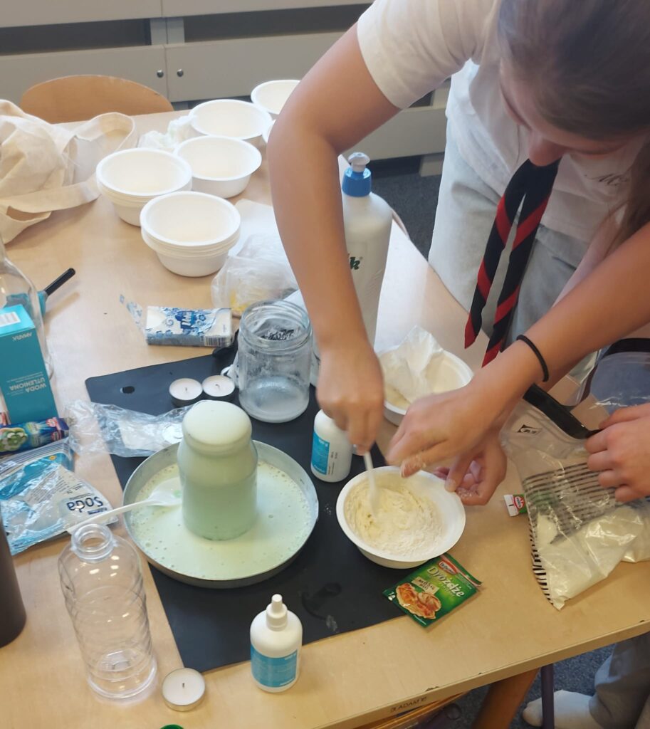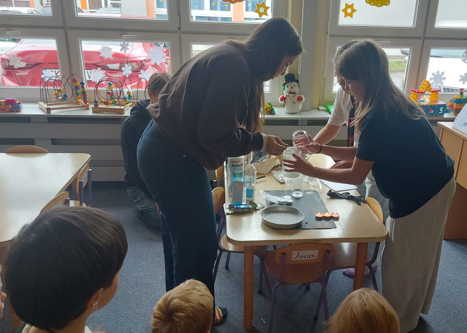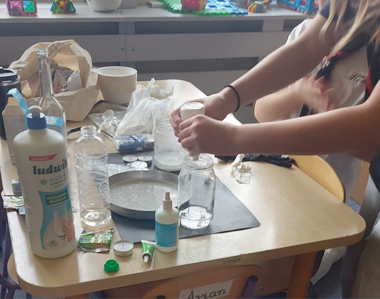 Dzisiejszego dnia w grupie Zajączków 🐰 gościliśmy harcerzy ⛺, którzy przygotowali dla dzieci fascynujące eksperymenty 🧪. Przy użyciu prostych materiałów – sody, słoików, świeczek i mąki ziemniaczanej – przedszkolaki obserwowały interesujące reakcje i zachowanie gazów. Zajączki z ogromnym zaangażowaniem badały, dotykały i odkrywały 🔍✨ świat nauki w praktyce!