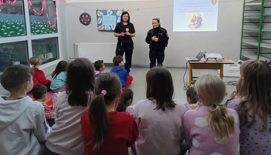 Przed zbliżającymi się feriami, dzieci ze świetlicy szkolnej wzięły udział w zajęciach edukacyjnych pt. „Bezpieczne ferie”, które przygotowali pracownicy zespołu Prewencji i Profilaktyki Społecznej Straży Miejskiej w Katowicach- Pani Małgorzata Dołbecka oraz Pani Joanna Szopa. Uczniowie dowiedzieli się jak prawidłowo spędzać czas wolny, unikać sytuacji niebezpiecznych oraz chronić siebie i innych podczas zabaw. Na zakończenie uczniowie utrwalili znajomość telefonów alarmowych oraz otrzymali odblaskowe elementy.