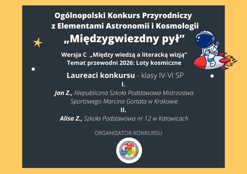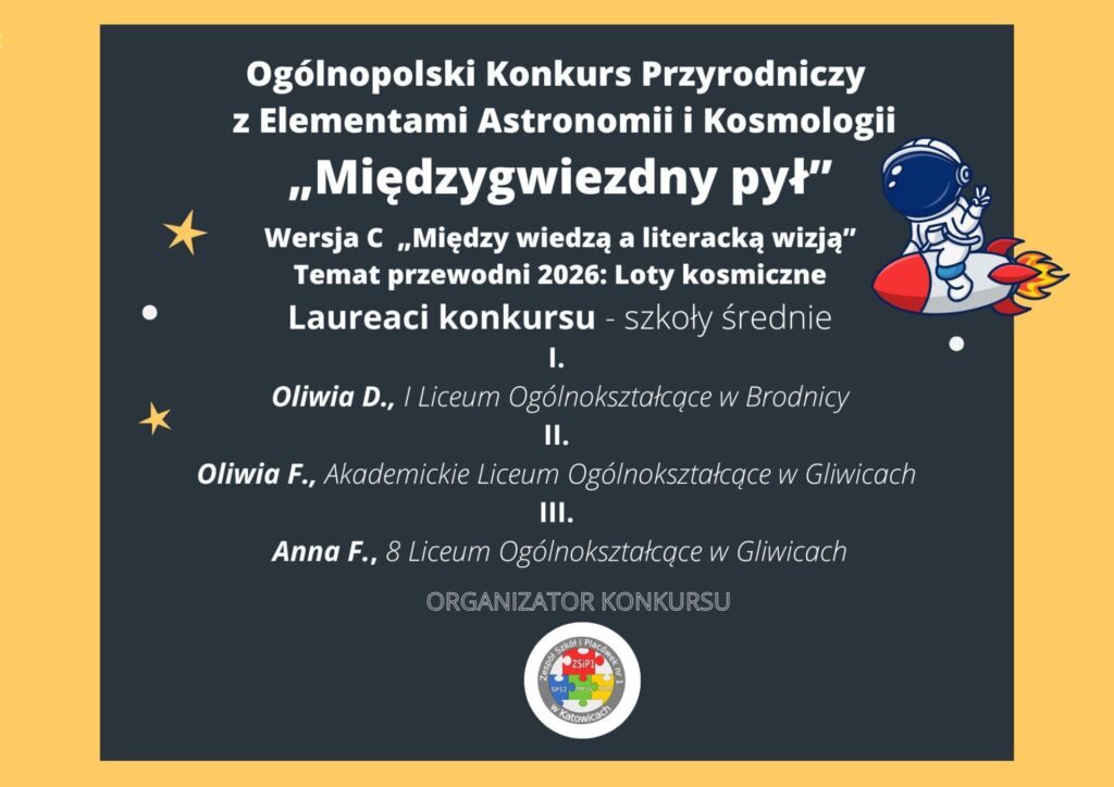 Serdecznie gratulujemy LAUREATOM Ogólnopolskiego Konkursu Przyrodniczego z Elementami Astronomii i Kosmologii „Międzygwiezdny pył” wersji literackiej.
